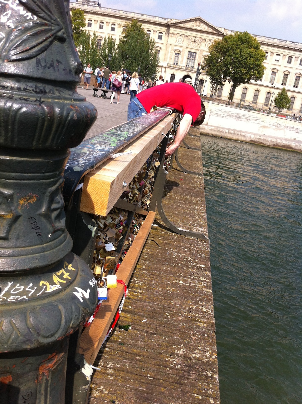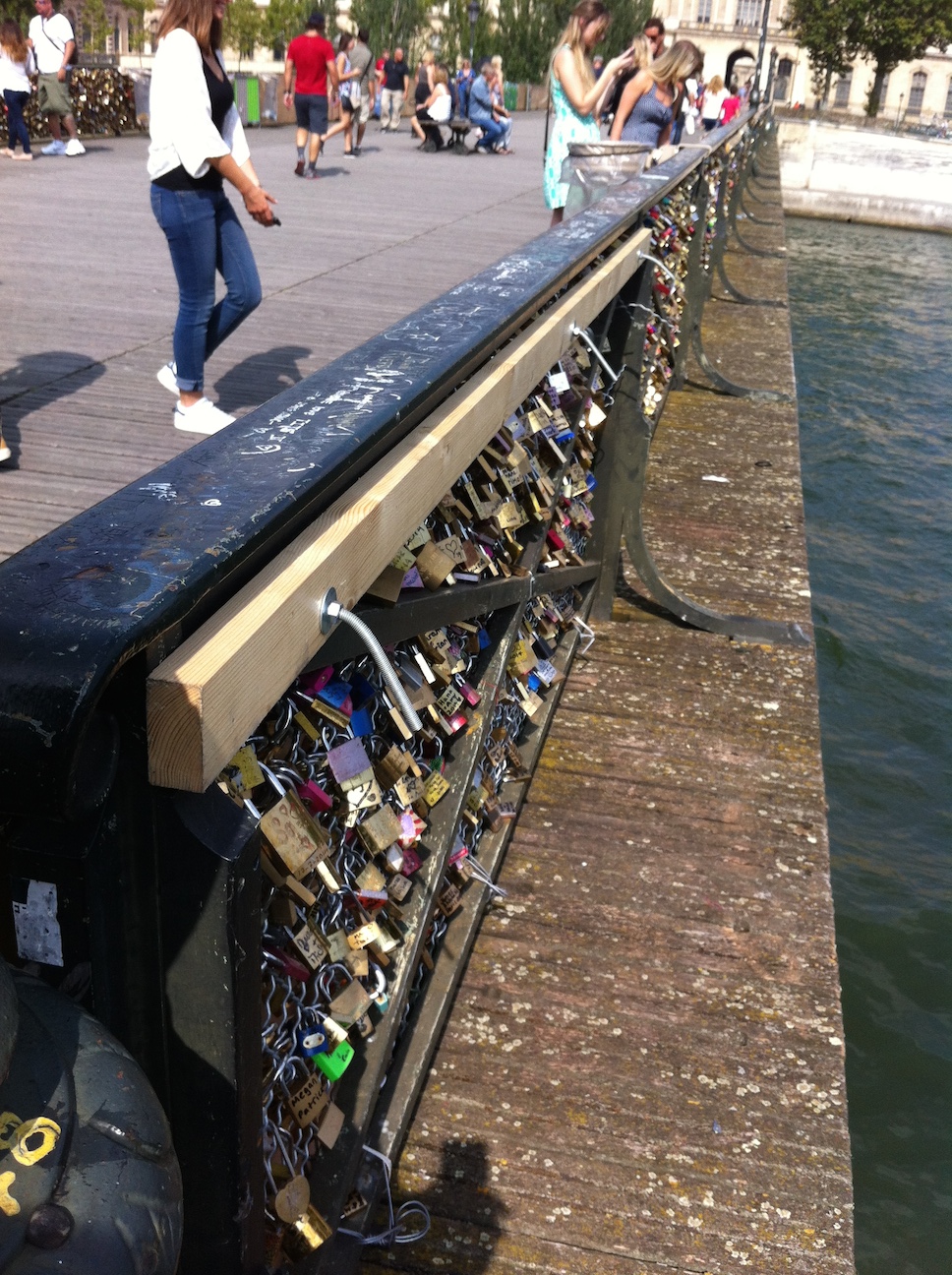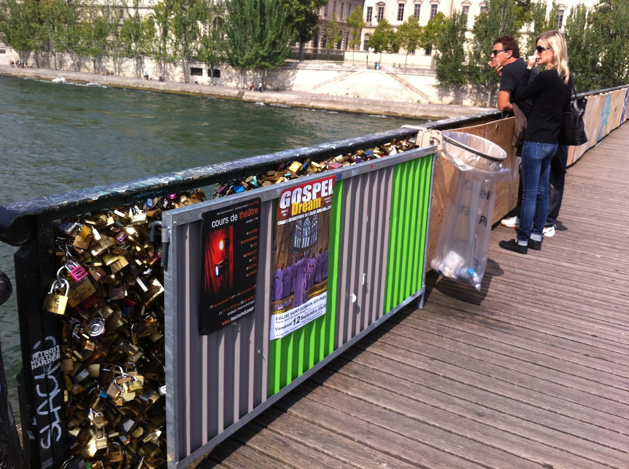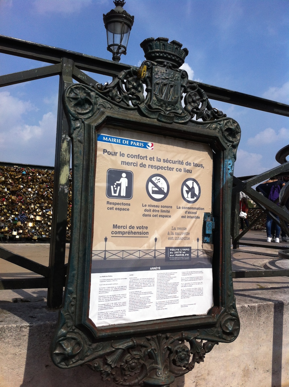 While this is exciting to see, the fight to rescue Paris from locks-obsessed tourists is far from over. There are so many bridges and monuments in Paris where this plague of padlocks have already spread, and it will not be easy to prevent them in all cases. We still intend to push for a ban on locks, and for multi-lingual signs to be posted at all bridges and monuments informing the public that padlocks on city property, on historic structures, will be treated as vandalism and subject to fines accordingly. It is clear that the City wants the locks to be gone from Paris, just as we do. We still firmly believe a ban will help make that a long-term reality, and we still urge our supporters to continue to spread the word that love locks are NOT an appropriate symbol of love and that they are selfish acts of vandalism. The love locks epidemic is the result of a certain type of tourist, someone with an entitlement mentality. But let’s be clear – no one has the right to put a lock on Paris!