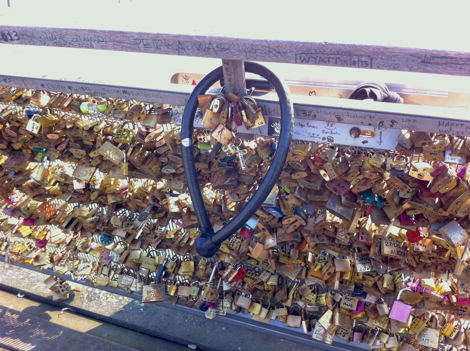 There are over 11 bridges and several landmarks in Paris inundated with tourists’ locks. People even hang locks on garbage cans and private houses. An illegal vendor has hung this bike chain so he can sell more locks adding to the weight on this footbridge.