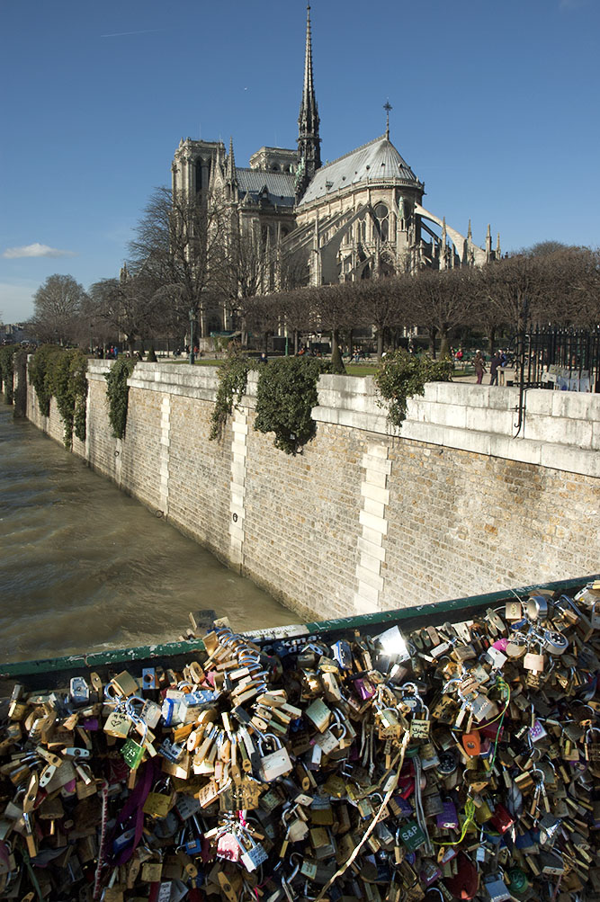 photo-60I hadn’t been paying attention to the bridges in the center of the city; I was too busy building a life in the 11th arrondissement. Then in November, I saw what had become of the Pont de l’Archevêché, a tiny bridge that connects Notre Dame with Quai de Montebello. In what seemed like mere months, it had been inundated by an infestation of locks, a dense metallic clump of “love,” that crept over the side of the bridge like a fungus. And the size of some locks was shocking—huge, some up to four inches across (10cm). Heavy bike locks had been attached to the bridge, seemingly to create an additional surface for hanging more locks since all the available meshing was used up. Graffiti had sprouted on the stone wall where locks were unable to be attached. People had taken to scratching messages in the paint on the railing. This wasn’t love. It felt like madness, like an invading army had seized the bridge. I’d known the Pont des Arts was falling prey to this mania, but now this bridge? I became like a crazy person. This was a bridge too far.